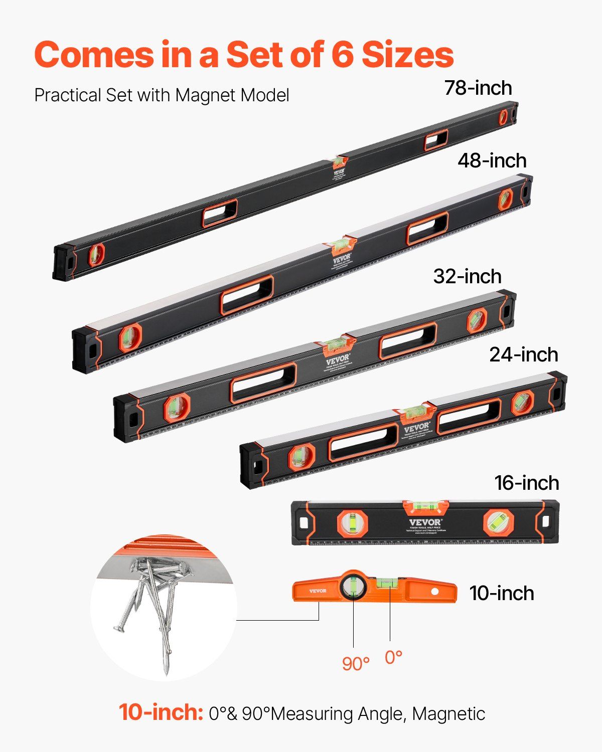 6-Piece Torpedo Level, 78/48/32/24/16/10 Inch Box Levels Set, Bubble Vials Ruler for 45/90/180 Degree, Shock-Proof Aluminum Alloy Magnetic Leveler To 6-Piece Torpedo Level, 78/48/32/24/16/10 Inch Box Levels Set, Bubble Vials Ruler for 45/90/180 Degree, Shock-Proof Aluminum Alloy Magnetic Leveler To 6-Piece Torpedo Level, 78/48/32/24/16/10 Inch Box Levels Set, Bubble Vials Ruler for 45/90/180 Degree, Shock-Proof Aluminum Alloy Magnetic Leveler To