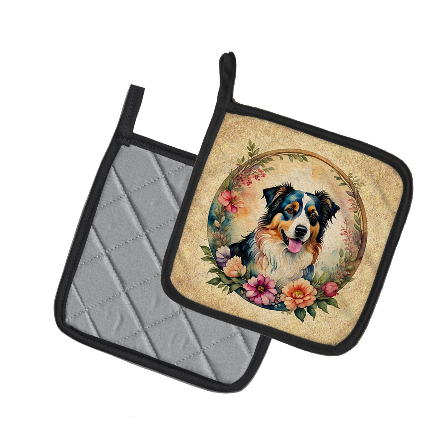Home > Australian Shepherd and Flowers Pair of Pot Holders Kitchen Heat Resistant Pot Holders Sets Oven Hot Pads for Cooking Baking BBQ, 7 1/2 x 7 1/2